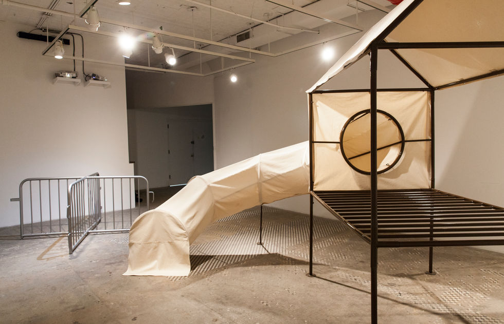 Normalization of materials and behavior in society often starts with children and methods of education like that of play. The work in Crowd Control creates an alternate reality, a dystopian present, of play equipment that blatantly without manipulation or passivity works to normalize these materials and their uses.