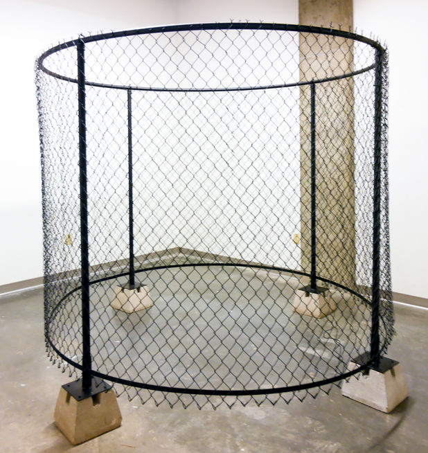 The first in a series of sculptures, Untitled (Circle) addresses the cyclical nature of power. It forces the viewer to interact with the sculpture as there are only 18 inches between it and the wall for the viewer's body to engage. Untitled (circle) creates a tension for the viewer's uncertainty of wanting to stay or leave based on its positioning and a confusion to understand which side of the fence each viewer is on.